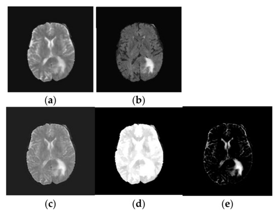 Figure 3. Texture decomposition using TV-L1 approach: (a) T2-weighted brain MRI tumor image; (b) Flair modality brain MRI tumor image; (c) Fused brain MRI tumor image; (d) Geometric component of fused brain MRI tumor image; (e) Texture component of fused brain MRI tumor image.