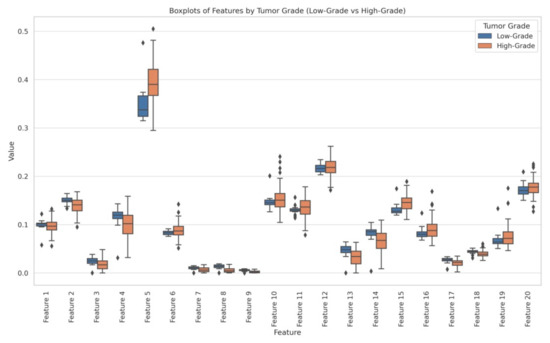 For a better understanding, we generated a box plot to visualize the distribution of each feature between LG and HG, confirming clear distinctions in their values. Figure 4 represents the box plots of LG and HG features.