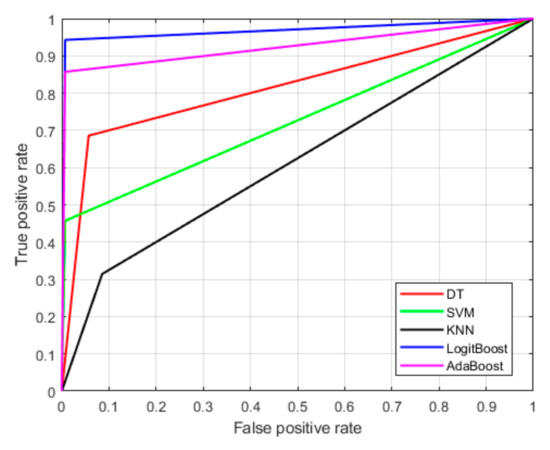 Figure 5 illustrates the receiver operating characteristic (ROC) curves for various machine learning models, evaluating their classification performance. The x-axis represents the false positive rate (FPR), which measures the proportion of LG tumors incorrectly classified as HG. The y-axis represents the true positive rate (TPR), which indicates the proportion of HG tumors correctly identified by the model. An optimal classifier would have an ROC curve that closely follows the top-left corner, reflecting a high TPR and a low FPR. From the figure, LogitBoost demonstrates the best performance compared with the other models. This indicates that the LogitBoost algorithm is highly effective at correctly identifying malignant brain tumors while minimizing the likelihood of misclassifying benign tumors.