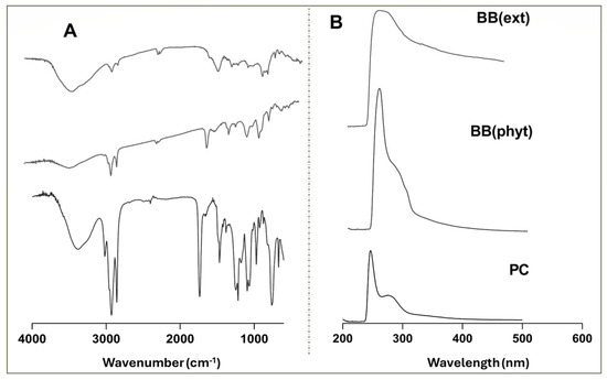 Spectral profile of the BB extract, the phytosomes, and the phosphatidylcholine molecule: (A) FTIR; (B) UV–Vis.