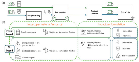 Indicative approach for simplified LCA highlighting the main effects on environmental impact for bio-based versus fossil-based additives in coatings, with (a) comparative processing chain between fossil-based and bio-based coating formulations focusing on main contributions of pre-processing and product lifetime and (b) different impacts and selection of functional units.