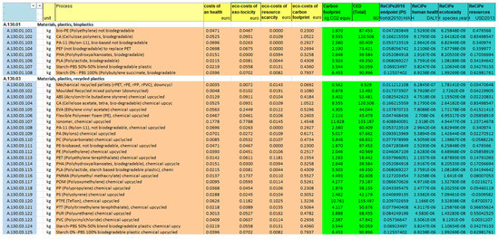 Data for environmental parameters according to the eco-cost method (including carbon footprint [kg CO2 eq], total eco-cost [EUR], and specific eco-costs [EUR] related to human health, eco-toxicity, resource scarcity, and carbon) are retrieved from the Idemat database (v2.2, 2024). Preference for the database was based on transparent calculations, availability of up-to-date values, and a science-based approach. A single database version was used in order to enable this benchmarking study, for which an example of retrieved information is shown in Figure 2. Environmental impact data for different categories of basic additives can be either found directly in the database, or proximate data for processed biomass are expressed in terms of energy input [MJ] needed for processing the biomass into suitable additive form, selecting the impact based on the environmental parameters of average European electricity (EU-27). Based on previous reports [12], the calculation results according to the eco-cost method provide some lower impact as compared to Ecoinvent results, as the latter often include older (or extrapolated) datasets and lag behind on data for electricity. In contrast with Idemat, Ecoinvent also includes infrastructure and does not have a cut-off point. Therefore, differences of approximately 2% are to be expected, where Ecoinvent is more on the safe side (‘precautionary principle’) by implementing worst-case scenarios. Moreover, Idemat is frequently used as a materials selection tool for a comparative analysis, including a dataset of more than 1000 materials, services, production processes, and end-of-life scenarios. It is based on data from the Swiss Ecoinvent database and CES EduPack, plus additional LCIs made by Delft University of Technology [13].