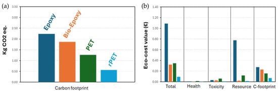 Inventory of environmental impact parameters for epoxy versus bio-epoxy and PET versus rPET binders used in coating formulations: (a) CO2 carbon footprint and (b) eco-cost values for different environmental impact categories (colors indicate different binders as indicated in (a)).