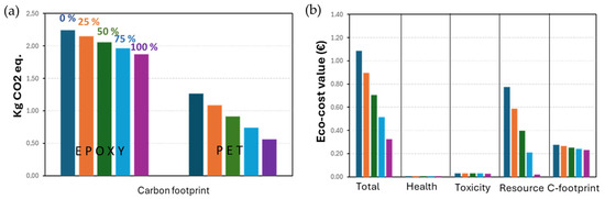 Variation in environmental impact parameters for gradual substitution of fossil-based epoxy (DGEBA + amine) into bio-based epoxy (vegetable oil + bio-based acid) or PET into rPET: (a) CO2 carbon footprint for epoxy and PET and (b) eco-cost values for different environmental impact categories for epoxy (colors indicate different wt.% of bio-based binders as indicated in (a)).