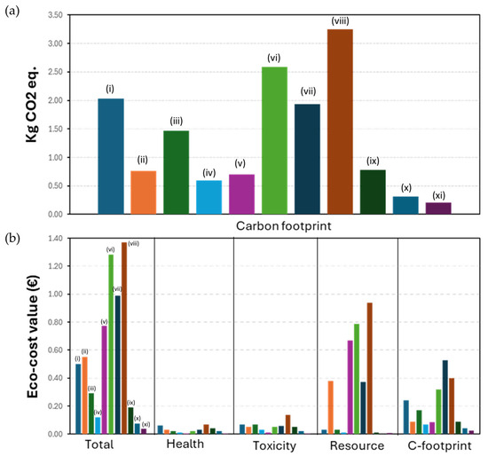 Inventory of environmental impact parameters for selected fossil-based (F) and bio-based (B) functional additives: (a) CO2 carbon footprint and (b) eco-cost values for different environmental impact categories for (i) silicate (F), (ii) rice husk biochar (B), (iii) calcium carbonate (virgin, F), (iv) calcium carbonate (renewable, B), (v) cellulose (wood pulp, B), (vi) nanocellulose (cellulose fibers, B), (vii) nanocellulose (from wood pulp, B), (viii) carbon black (F), (ix) polyethylene wax (F), (x) biowax (general, B), and (xi) cork granulate (B). The same color code applies for all samples.