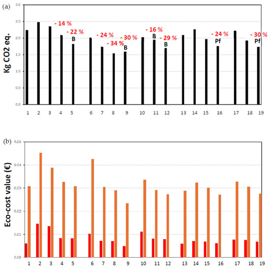 Calculated environmental impact parameters for different coating formulations (samples 1 to 19 as detailed in Table 3): (a) CO2 carbon footprint; (b) eco-cost values for different environmental impact categories: human health (red bar) and eco-toxicity (orange bar); and (c) eco-cost values for different environmental impact categories: resource scarcity (green bar) and carbon footprint (blue bar). Bio-based coatings are indicated as ‘B’ and performance credit as ‘Pf’.