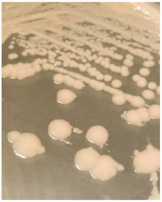 The artificially contaminated aluminium foils simplified isolation and detection because the surfaces were contaminated with known monoculture P. hauseri ATCC 13315. The isolated colonies show non-swarming on the TSA (Figure 1) and Blood agar plate (Figure 2a) after 24 ± 2 h of incubation. Growth of P. hauseri on the Blood agar plates after 26 h of incubation (Figure 2b) showed no haemolysis. After prolonged incubation of plates for five days, alpha haemolysis appeared, indicating mild swarming. Both used media had 5.0 g/L of sodium chloride (NaCl). Nissanka et al. [16] investigated the growth of P. mirabilis on Nutrient agar plates prepared with a range of sodium NaCl concentrations from 0.1 to 5.0 g/L. They concluded that P. mirabilis did not swarm on modified Nutrient agar with a NaCl concentration of ≤0.66 g/L.