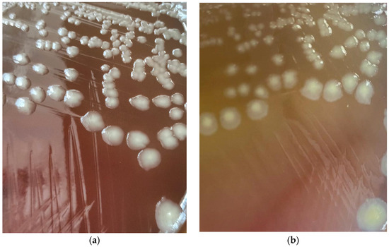 Colonies of P. hauseri on the Blood agar plate: (a) after 26 h of incubation; (b) after 5 days of incubation.