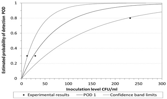 The test results of the artificially contaminated surfaces are presented in Table 1. The number of tested surfaces and the number of surfaces with detected Proteus hauseri are used for the calculation of POD (Figure 3) and LOD, following Wirlich and Wilrich [15].
