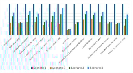 Actually, scenario 2, which considered UHPC without GO, resulted in equal or lower environmental impacts than scenarios 1, 3, and 4 in all impact categories. Scenarios 3 and 4 also had lower impacts than scenario 1 for all of the impact categories. Still, they also had higher values than scenario 2 for all impact categories. Notably, scenario 4, with a higher content of GO, resulted in a higher environmental burden than scenario 2 due to a higher increase in impacts through the addition of GO compared to the increase in strength (from 160 MPa to 180 MPa). Especially in terms of resource demand, the addition of GO in UHPC resulted in a high impact in resources depletion and water scarcity, as presented in Figure 2. This indicates that GO has the potential to contribute to the reduction in impacts for different categories as it enables an increase in concrete strength for UHPC, but the enhancement of the GO manufacturing process would be required mainly in terms of resources demanded for the production. Since the LCI data for GO production were based on small-scale laboratory tests, the scalability of GO manufacturing process could be supportive to reduce environmental impacts by considering commercial production of this material. However, the degree to which this contributes should be further investigated.