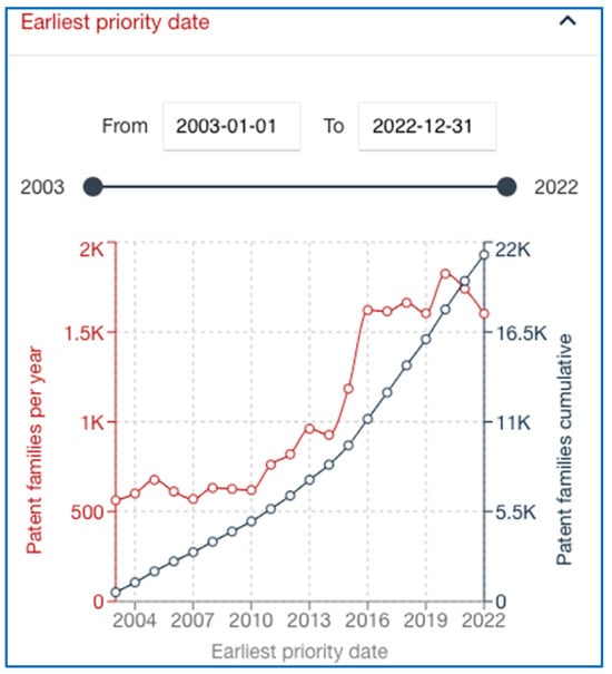 The results were analyzed according to the earliest priority date of filing and within the time frame between 2003 and 2022, which contains 21,222 patent documents. As illustrated in Figure 1, there is a discernible upward trend, with a slope change between 2014 and 2016, followed by a period in which the trend remains constant.