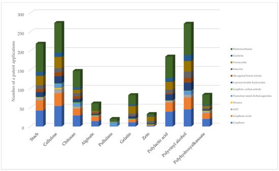A survey of the patent literature reveals that the most frequently utilized biopolymers in conjunction with two-dimensional nanomaterials are cellulose, polyvinyl alcohol, starch, polylactic acid, and chitosan [] (see Figure 4).