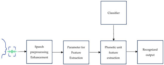 Signal preprocessing techniques like pre-emphasis, frame blocking, and windowing are among the architectural components that make up a conventional speech recognition system. These operations extract parameters like pitch, intensity, and features. The Mel-frequency cepstral coefficients (MFCCs) technique is a widely used feature extraction method involving FFT, Mel-scale filter bank, logarithm, and DCT operations. The speech recognition process using classifiers involves audio signal preprocessing, feature extraction, and classification [19,20]. The earliest approaches to speech recognition were based on finding speech sounds and providing appropriate labels to these sounds [21]. Figure 1 shows the suggested block diagram for a speech-based recognition system. The primary focus of speech recognition is to train the system to recognize an individual’s unique voice characteristics.