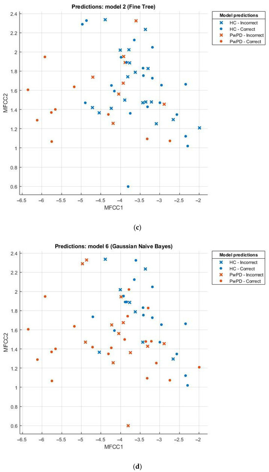 (a) Scatter plot for KNN; (b) scatter plot for SVM; (c) scatter plot for fine tree; (d) scatter plot for naïve Bayes.