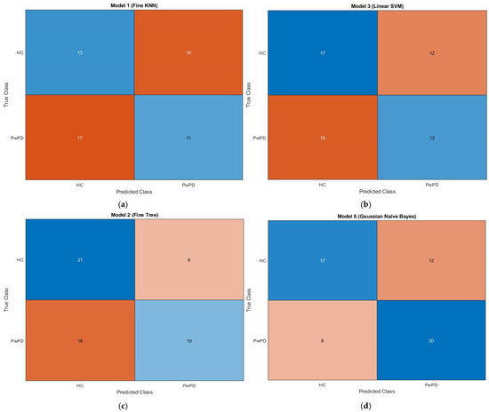 Confusion matrices showing classification results for (a) KNN, (b) SVM, (c) Fine Tree, and (d) Naïve Bayes algorithms. Each matrix displays the true labels (rows) vs. predicted labels (columns). The colour intensity indicates the number of samples, with darker shades representing higher values. Typically, diagonal cells (true positives and true negatives) are shaded more intensely when the classifier performs well, whereas off-diagonal cells (false positives and false negatives) appear lighter or differently colored depending on the error count. The brown and blue dotted lines in the associated plots represent individuals with Parkinson’s disease and healthy individuals, respectively.