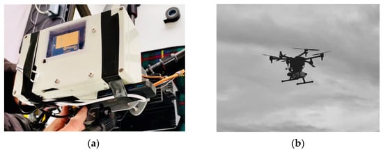 Drone payload: (a) The data collection payload being attached to the drone; (b) The drone with payload attached in-flight.