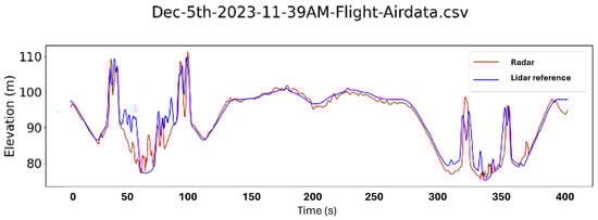 To assess the accuracy of the measured ground elevation profile using the radar, we compared it against a digital terrain model from the UK’s Department for Environment, Farming and Rural Affairs (DEFRA) []. This open-source model is derived from airborne lidar surveys and provides an accurate estimate of terrain elevation across 99% of the UK, with 1-m horizontal resolution and 15-cm vertical resolution. Figure 4 shows an example comparison of the radar-derived elevation against the lidar data, demonstrating good agreement in general. These data correspond to three back-to-back return journeys, each approximately 800 m in length. The radar-derived ground elevation is calculated by subtracting the measured elevation of the radar above the ground from the drone’s barometer-derived absolute altitude estimate.