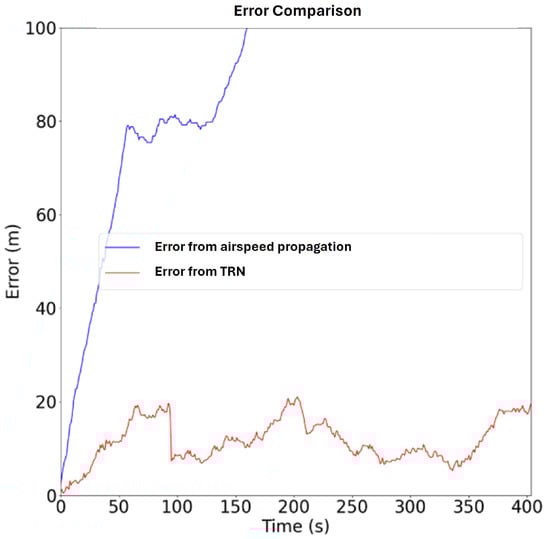 Error growth of mm-wave radar TRN vs. use of airspeed data only.