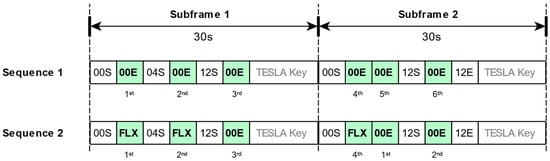 The transmission of tags in the OSNMA message is defined in a sequence that lasts two subframes. Each position of the sequence indicates the ADKD of the tag and if the tag is self-authenticating (S) or cross-authenticating (E). There are also positions with a flexible tag type (FLX), which the receiver must verify using a different method. In this work, we are interested in the cross-authentication ADKD 0 tags, or 00E in the sequence. A complete description of the OSNMA protocol can be found in the interface control document [6].