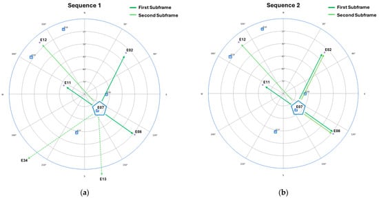 To exemplify how both algorithms work, we are using real data recorded in November 2023 with Sequence 1 in force and simulating how the same scenario would be with Sequence 2. The results are shown in Figure 2, where the cross-authenticating tags for satellite E07 are displayed as arrows to those satellites. When following the order for Sequence 1, two of the three cross-authentication tags of the second subframe are issued for satellites under the horizon (E34 and E13). However, when using the Sequence 2 order, those two positions are used to authenticate the two closest disconnected satellites again. This is a huge improvement since, otherwise, a receiver would have to wait for another 30 s (one subframe) to authenticate the closest satellites.