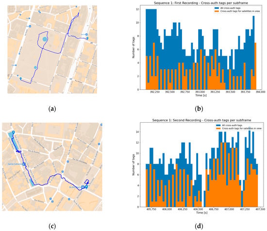 Live recording for Sequence 2, on 3 December 2023. (a,c) Trajectory followed in the recordings. (b,d) Total cross-authentication tags (in blue) and the subset received for a satellite in view in the last 30 s (in orange). There is no clear difference between consecutive subframes.