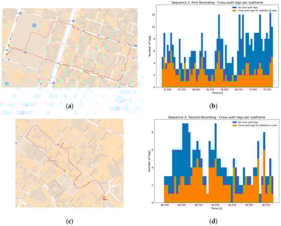 The effect of Sequence 1, with the second subframe having the cross-authentication tags for the further away satellites, is clearly visible in the alternation of orange bars for both recordings (Figure 4b,d). Even in the sections of the trajectory with better visibility, some subframes are completed without receiving any cross-authentication tag for a satellite seen in the last 30 s.