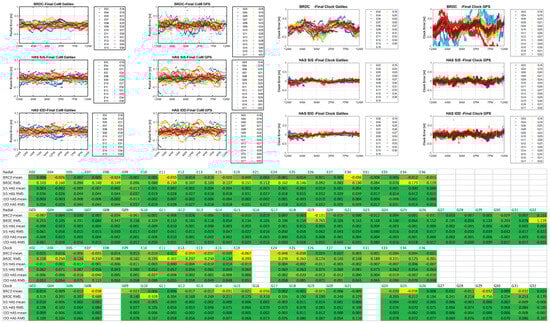 Satellite position radial (the six boxes on the left) and clock (the six boxes on the right) errors as a function of the time. The errors are computed with respect to the Final MGEC CODE products. The upper boxes shows the results for the Broadcast case, the central boxes for the HAS SIS products, and the lower boxes for the HAS IDD products. Galileo’s performance is presented on the left, while the GPS performance is presented on the right of each group of six boxes. On the bottom, the detailed mean and RMS of the radial and clock errors for Galileo and GPS are presented for the same cases.