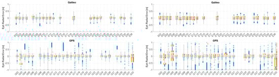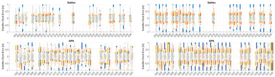 Figure 3 and Figure 4 show, respectively, the radial component errors and the satellite clock errors over a period of one month. In the top boxes, the Galileo case is shown while, in the bottom ones, GPS satellites are considered. For each satellite, identified by its ID, the colored dots represent the occurrences of the difference over the 95%-ile, the black line shows the 95%-ile, the rectangle represents the STD, and the horizontal line shows the median value of the errors for the period of interest. The improvement in HAS products over the OS ephemeris is noticeable for both IDD and SIS corrections.