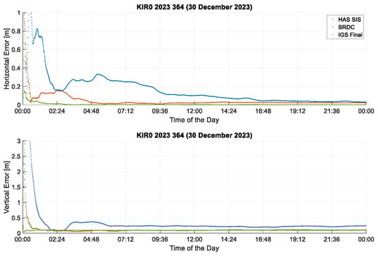 One-day PPP solution for the three cases with broadcast, HAS products, and MGEX final products for KIR0.