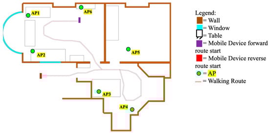 The methodology for testing the SLAM algorithm involved moving through a route in an environment in both the forward and reverse directions. These routes were designed to enable NLOS signal reception to occur. The routes and environment explored are shown in Figure 2. The trials involved a pedestrian holding the smartphone and walking on top of fixed step markers placed on the ground along the route of the trial. The markers were approximately 670 mm apart; the location of each marker was measured against the reference points in the environment to generate the step marker’s ground truth coordinates. In order to align the ground truth data with the measured data, the trials were filmed. The timestamps of the steps from the video were used to determine the expected position of a device at a given time, allowing the algorithms to have an accurate comparison point at each step. The standard deviation of the step length assuming white noise, which was used to determine the noise applied during the prediction step, was calibrated as follows. A pedestrian carrying the mobile device walks 20 steps in a straight line 10 times; the real distance travelled is measured and the estimated distance travelled is calculated using the PDR model; the standard deviation of the difference is computed, and this is divided by the number of steps to give the standard deviation of a step. All data were collected simultaneously using a custom mobile app. RTT and RSSI measurements were received at 100 ms intervals, and IMU data were collected at approximately 20 ms intervals. RSSI-based outlier detection is implemented as described by Raja and Groves [3]. A Google Pixel 4a smartphone was used in combination with 3 Google Nest WiFi Routers, a Google WiFi Router, and 2 Google WiFi Points. The fixed instrument bias for each router was calibrated out of the range estimates.