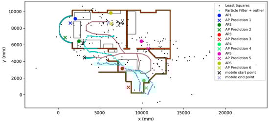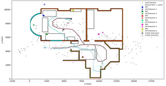 WiFi–RTT-based positioning has been explored by several different authors. Gentner et al. [4] reviewed the distribution of the WiFi–RTT distance estimation errors and developed a Gaussian mixture model. This model was then used in a particle filter. In an experiment involving a person carrying the mobile device that was being tracked, the average positioning error was found to be 0.93 m with a standard deviation of 0.88 m, which is an improvement of 0.45 m compared to the model using a standard Gaussian measurement model, which had a standard deviation of 0.95 m. Guo et al. [5] opted for a different approach that revolved around a hybrid RSSI and RTT model. The paper compared RSSI fingerprinting against a Kalman filter using WiFi–RTT ranging data. The average positioning error of the fingerprinting was 3.41 m with a standard deviation of 1.993 m, whilst the Kalman filter had an error of 2.04 m and a standard deviation of 1.286 m for the same environment. When an RSSI outlier detection method was used, the positioning error of the RTT-based Kalman filter improved to 1.44 m with a standard deviation of 0.819 m. Sun et al. [6] integrated pedestrian dead reckoning (PDR) with WiFi–RTT in an extended Kalman filter. This method achieved an average positioning error of 0.98 m and an average RMSE of 1.1 m. Whilst the performance of the algorithms developed for the discussed papers was promising, all papers assumed that the location of the APs was known. This is a key limitation of indoor positioning as it results in a lengthy data collection phase that can be impractical at scale.