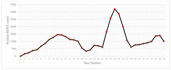 The final landmark-estimated coordinates were also gathered and discussed here. AP6 reached a horizontal error of just 0.16 m, while AP3 reached a maximum horizontal error of 2.4 m. This is visualised in Figure 3. This demonstrates that the algorithm was able to identify the location of the landmarks to an acceptable degree of accuracy during this trial. In the forward trial, as can be seen in Figure 3, the path of the device roughly matches the shape of the true path of the pedestrian. For the reverse trial landmark final position horizontal error, the average AP final position horizontal error is 1.4 m, with the lowest position horizontal error being 0.78 m and the highest position horizontal error being 2.4 m. Interestingly, in the forward scenario, AP3 had a horizontal error of 0.58 m, and the same AP had a horizontal error of 2.4 m in the reverse scenario. This information is summarised in Table 2.