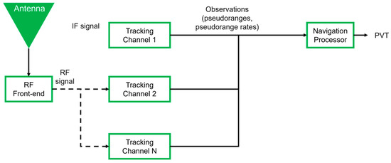 As can be seen in Figure 2, the output of the tracking channels (e.g., pseudoranges and pseudorange rates) goes directly to the navigation processor to compute the Position-Velocity-Time (PVT) solution of the receiver. There is no feedback link from the navigation processor to the tracking channels. Tracking and positioning are two clearly separate algorithms.