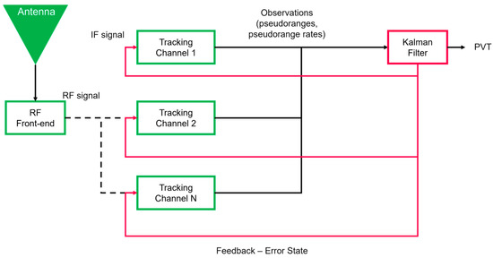 The next tracking algorithm is called Vector Tracking (VT). In [6] (p. 438), Vector tracking is described as one of the most advanced signal processing methods and was proposed in 1980. In [7,8,9] the general design of vector tracking and the better performance relating to scalar tracking was investigated. In comparison to a conventional navigation processor, a Kalman Filter, respectively an Extended Kalman Filter is implemented and integrated in the tracking loop (see Figure 3). The Kalman Filter creates a feedback link between the PVT computation and each tracking channel. Therefore, the two steps (i.e., tracking and positioning) are combined into one algorithm. In [9] (pp. 391–396) two different formulations of this algorithm are described: the position-state formulation and the pseudorange-state formulation. In our concept, the first one is used. VT has a lot of advantages instead of using the scalar tracking algorithm.