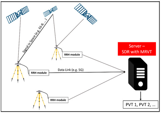 The overall goal of this research is to develop a software-defined GNSS receiver, which can process raw I&Q samples from GPS and Galileo satellites of multiple receivers in one single algorithm. Therefore, one of the most advanced receiver tracking methods is used. The so-called Multi-Receiver-Vector Tracking algorithm, which is described in Section 2.2 in more detail. The basic idea is to build a GNSS monitoring network where the hardware is reduced to a minimum. In this concept, each GNSS network station is equipped with an antenna, an RF Front-End (RRH module), and a link for data transfer (cf. Figure 5).