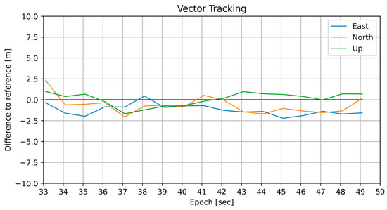 As it can be seen in Figure 7 and Figure 8, the positioning solutions, which are processed with vector tracking are slightly better than the traditional tracking method. One reason for that is the Kalman Filter. Vector tracking uses, beside the measurements, a dynamic model, to predict the state vector of the new epoch and combines the prediction and the measurements optimally and provides a Line-of-sight feedback from the PVT to the tracking part. The result of such mathematical operation are smoother position solutions of the receiver. The output from a Kalman Filter strongly depends on the initial parameters and settings of the filter and must be adjusted for different scenarios. The initial state vector (i.e., position, velocity, clock bias and clock drift) comes from scalar tracking as a preliminary stage. In [9], Vector tracking is described as a robust tracking method, which brings a decisive advantage in challenging environments of tracking signals with a lower carrier-to-noise power density ratio.