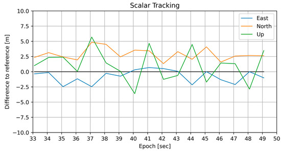 In Table 1, the mean deviation of all position solutions to the reference position differs between the two tracking methods is shown. Vector tracking delivers better results than scalar tracking. This can also be seen in the standard deviation. Due to the Kalman Filter, vector tracking generates a smoother time series of position solutions than the standard tracking procedure does. To evaluate the filter, the dynamic model was set as kinematic with very low receiver motion. First investigations show that the initial state vector and the filter parameters of the Kalman Filter have a big influence on the results. To find the right parameters for this concept, the settings will be further investigated.