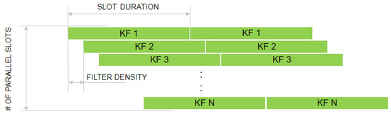 The simplified principle of the RIVL design based on parallel filters is depicted in Figure 2. This figure defines the bank of filters (1 to N) running in parallel for the pre-defined time (slot duration). Each filter operates with a pre-defined range of input data and the operational time lag is defined by the filter density value.