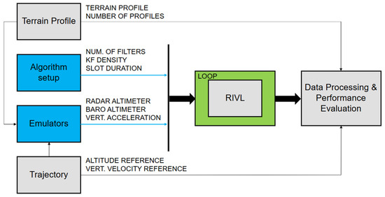 The simulation framework prepared for Monte Carlo analysis of the RIVL algorithm including sensor emulators, trajectory, terrain profiles, and performance evaluation block.