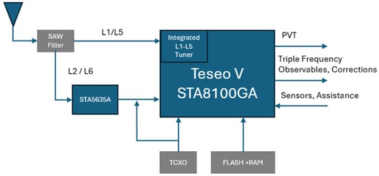 - STMicroelectronics. Teseo V Family Automotive Triple-Band Multi-Constellation GNSS Precise Engine Receiver. Available online: https://www.st.com/en/automotive-infotainment-and-telematics/sta8135ga.html (accessed on 1 April 2024).