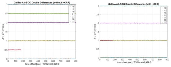 Results of a zero-baseline test with CP measurements from a TeseoV receiver (rover) and a Trimble BD990 device (base). (Left) Results without the meta-signal CP HCAR algorithm: CP double differences are characterized by half-cycle ambiguities. (Right) Results obtained using the meta-signal CP HCAR algorithm: half-cycle ambiguities are effectively resolved.