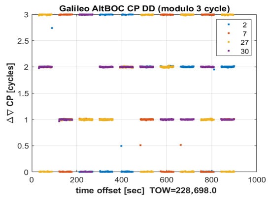 The analysis of the carrier phase double differences obtained in this trial confirms the consistency of the half-cycle ambiguity recovery method for meta-signals observables. CP measurements align around integer values every time the receiver front-end is turned on. This supports the effectiveness of the proposed HCAR detector. Results are reported in Figure 5.