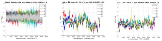 For the PSR analysis, a 3 h test was carried out (Figure 6). Multipath effects are evident on E5a and E5b double difference result (center and right subplots), while synthetic Alt-BOC measurements are aligned (no jump) to the BD990 true version with a 95-percentile noise deviation in the 20 cm range (left subplot).