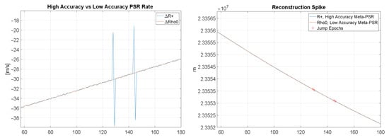 Since meta-signal PSR reconstruction requires the ambiguity resolution of the side-band wide-lane carrier phase combination, jumps in the reconstructed measurements can occur. This is addressed using the jump detector introduced in Section 3.2. An example of the ability of the jump detector to identify and remove jump effects is shown in Figure 7.