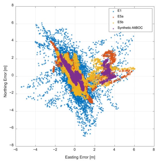 In Figure 8, the horizontal positioning errors obtained using single-frequency SPP algorithms using the PSR from E1 (blue markers), E5a (orange markers), E5b (yellow markers) and Alt-BOC synthetic measurements (purple markers) are shown. From the figure, it can be noted that the solutions are centered on the origin of the axes and no specific biases can be appreciated for the different solutions. All the solutions have a similar behavior, but the solutions obtained with the synthetic observables are more accurate: the purple cloud is more concentrated than the others showing the clear benefits of the synthetic approach also with respect to the classical E1 solution.