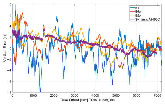The time evolution of the vertical error is shown in Figure 9. Also, for the vertical components, the solutions have a similar behavior, and clear noise reduction can be noted using the synthetic Alt-BOC measurements.