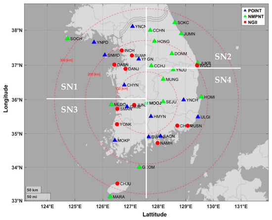 To evaluate the performance of the proposed architecture, we collected dual-frequency GPS observation data on DOY207, 2023. The observational data were obtained in receiver independent exchange format (RINEX), with a 1 Hz sampling rate, from various operators, including the National Maritime Positioning, Navigation and Timing (NMPNT) Office’s reference station, the Precise Positioning and Integrity Monitoring (POINT) project’s reference station, and the National Geographic Information Institute (NGII) reference station in South Korea.