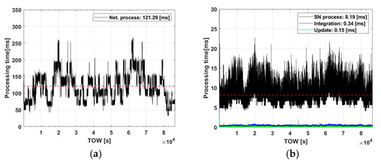 Figure 3 shows the processing time for both the centralized and decentralized architecture. The mean processing time is highlighted with red dashed line, centralized PPP-RTK is 121.29 ms per epoch, while the decentralized spends 8.19 ms per epoch in each SN. And for the integration, the update sequence took 0.34 ms and 0.15 ms each.
