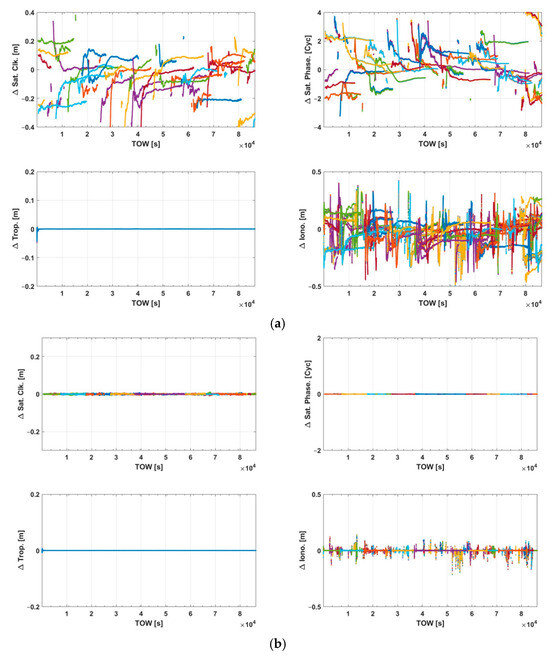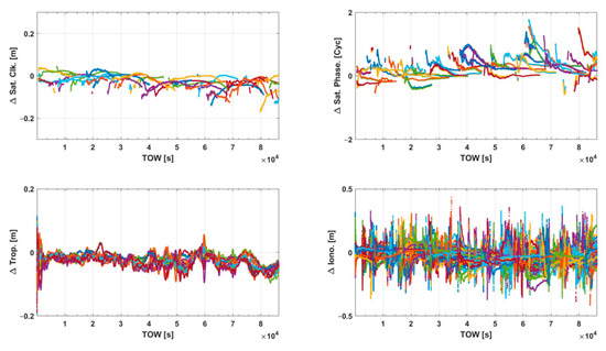 where the subscript ‘u’ represents the index of the user receiver, and ‘intp’ denotes the interpolated parameter. The user’s model is nearly identical to the PPP-RTK server model, but it specifically estimates the user’s position differential vector and the line-of-sight vector from the user to the satellite, . The user first subtracts the integrated satellite clock and phase bias from its UDUC observation and applies the precise orbit data from the server to its broadcasted satellite orbit solution. Next, the ionospheric and tropospheric delays from the server, relative to the reference station or grid point, are interpolated to the user’s position and applied accordingly.