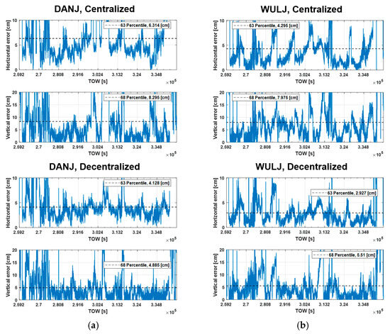 Table 4 shows the statistics for the daily horizontal and vertical positioning errors at the test sites for each architecture. The percentage in the decentralized results indicates the reduction in the positioning error compared to the centralized architecture.